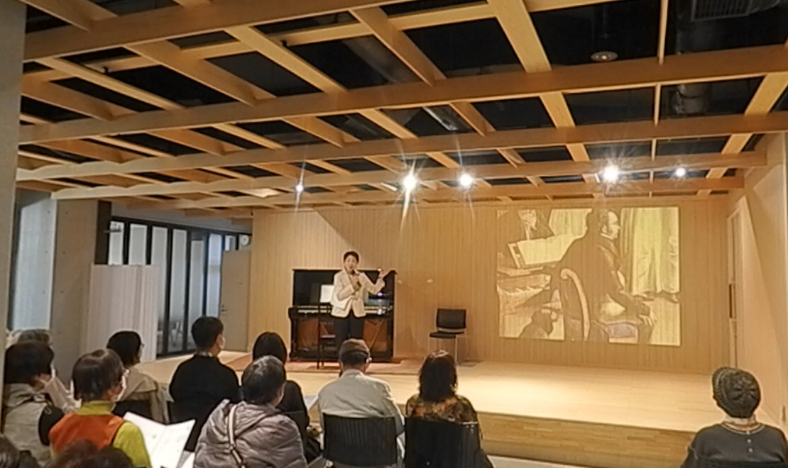 演奏:山崎法子(ソプラノ)、田中悠一郎(ピアノ) お話:藤本一子(音楽学)[歌曲って面白い] 歴史的背景のお話と作品解説を交えながら、日本歌曲とドイツ 歌曲の演奏を 通して歌曲の魅力に触れるコンサートです。 ソプラノ歌手とピアノによる素晴らしい演奏のほか、参加者に は歌詞集と資料が配付され、さらにドイツ歌曲の日本語字幕や 画像投射も行なわれて、参加者アンケートも大変好評をいただ きました。ロビー天井の建築構造が上質の音楽空間を生じるこ とも確認されました。 当日のお話と演奏の様子は、山崎法子氏のアカウントURLから ご覧いただけます。 → https://youtu.be/IQi01CR  |
